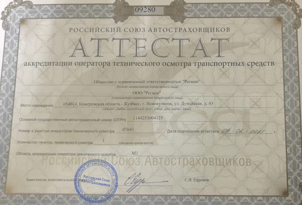 Общество с ограниченной ответственностью «РЕГИОН» (ООО «РЕГИОН») внесено в реестр операторов технического осмотра за №7641. По номеру оператора, указанному в аттестате, можно проверить аккредитацию на сайте РСА.